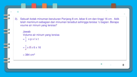 3).  Sebuah kotak minuman berukuran Panjang 8 cm, lebar 6 cm dan tinggi 16 cm.  Adik
