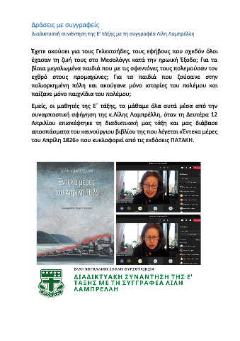 Διαδικτυακή συνάντηση της Ε’ τάξης με τη συγγραφέα Λίλη Λαμπρέλλη