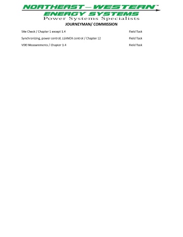 JOURNEYMAN/ COMMISSION Site Check / Chapter 1 except 1.4 Field Task Synchronizing, power control, LEANOX control / Chapter 12 Field Task VDE Measurements / Chapter 1.4 Field Task