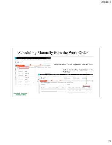 12/5/2019 Scheduling Manually from the Work Order Navigate to the WO and the Requirement & Bookings Tab Click on the + to add your appointment to the Work Order 70