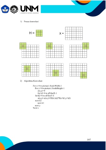 1) Proses konvolusi 2) Algoritma Konvolusi For x=0 to picture1.ScaleWidth-1 For y=0 to picture1.ScaleHeight-1 z(x,y)=0 for k1=0 to nFilterX-1 for k2=0 to nFilterY-1 z(x,y)=z(x,y)+H(k1,k2)*I(x+k1,y+k2) next k2 next k1 next y Next x 107