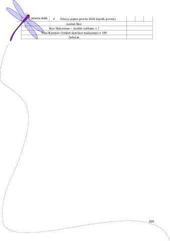 peserta didik 4 Adanya pujian peserta didik kepada gurunya Jumlah Skor Skor Maksimum = Jumlah indikator x 2 Nilai Kinerja= (Jumlah skor/skor maksimum) x 100 Sebutan 220