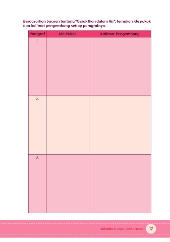 Berdasarkan bacaan tentang “Gerak Ikan dalam Air”, temukan ide pokok dan kalimat pengembang setiap paragrafnya. Paragraf Ide Pokok Kalimat Pengembang 1. 2. 3. Subtema 1: Organ Gerak Hewan 17
