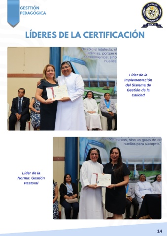 S GESTTIÓN PEDAGÓGICA LÍDERES DE LA CERTIFICACIÓN Líder de la Implementación del Sistema de Gestión de la Calidad Líder de la Norma: Gestión Pastoral A 14