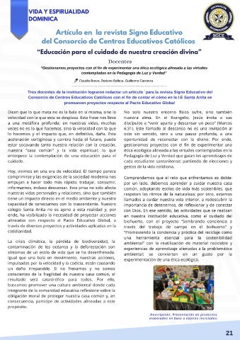 alineadas con respecto al Pacto Educativo Global, a biohuerto, con el proyecto “Sembrando conciencia a