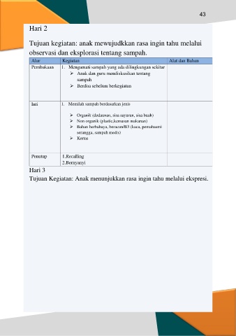 Tujuan kegiatan: anak mewujudkkan rasa ingin tahu melalui