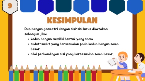 9 KESIMPULAN Dua bangun geometri dengan sisi-sisi lurus dikatakan sebangun jika: kedua bangun memiliki bentuk yang sama sudut-sudut yang bersesuaian pada kedua bangun sama besar nilai perbandingan sisi yang bersesuaian sama besar.