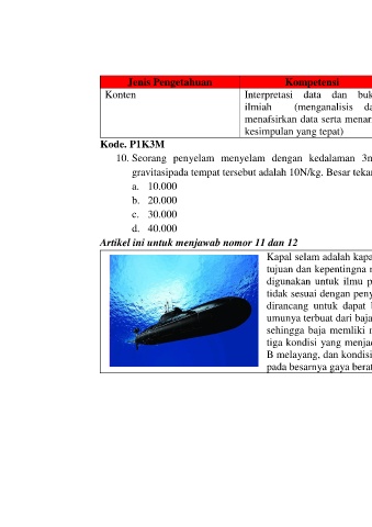 10. Seorang penyelam menyelam dengan kedalaman 3m, masa jenis air 1000kg/m , dan konstanta
