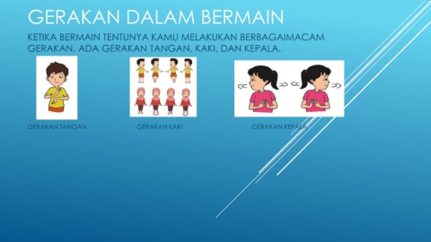 GERAKAN DALAM BERMAIN KETIKA BERMAIN TENTUNYA KAMU MELAKUKAN BERBAGAIMACAM GERAKAN, ADA GERAKAN TANGAN, KAKI, DAN KEPALA. GERAKAN TANGAN GERAKAN KAKI GERAKAN KEPALA