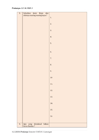 Prakarya– 3.1 /4.1/5/1.1 3. Sebutkan Jenis Kayu dan sifatnya masing masing kayu ? 1. 2. 3. 4. 5. 6. 7. 8. 9. 10 11. 12. 13. 14. 15. 16 4. Apa yang dimaksud bahan keras Bambu ? 4 | UKBM Prakarya Semester 5 MTsN 1 Lamongan