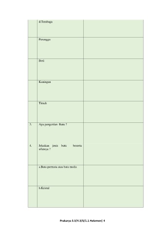 d.Tembaga Perunggu Besi Kuningan Timah 3. Apa pengertian Batu ? 4. Jelaskan jenis batu beserta sifatnya ? a.Batu permata atau batu mulia b.Kristal Prakarya 3.3/4.3/6/1.1 Halaman| 4