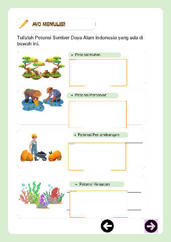 Ayo Menulis! Tulislah Potensi Sumber Daya Alam Indonesia yang ada di bawah ini. Potensi Hutan Potensi Pertanian Potensi Pertambangan Potensi Kelautan