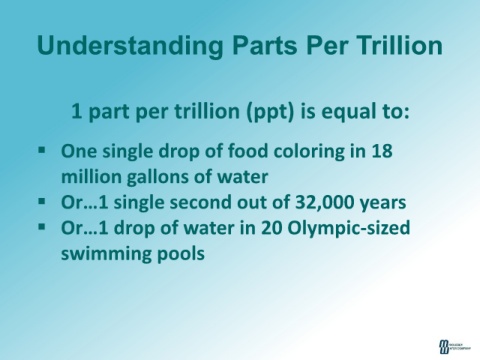 Understanding Parts Per Trillion 1 part per trillion (ppt) is equal to: One single drop of food coloring in 18 million gallons of water Or…1 single second out of 32,000 years Or…1 drop of water in 20 Olympic-sized swimming pools