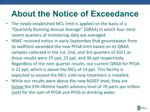 its wellfield exceeded the new PFOA limit based on its QRAA