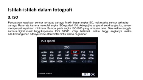 Pengaturan kepekaan sensor terhadap cahaya. Makin besar angka ISO, makin peka sensor terhadap