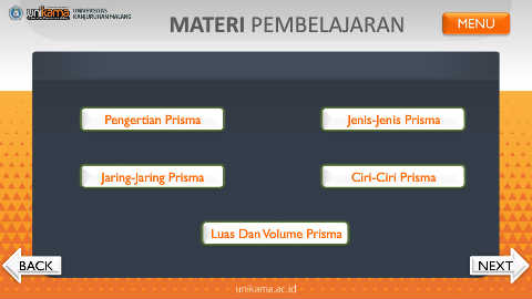 MATERI PEMBELAJARAN Pengertian Prisma Jenis-Jenis Prisma Jaring-Jaring Prisma Ciri-Ciri Prisma Luas Dan Volume Prisma