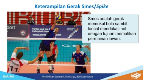 Keterampilan Gerak Smes/Spike Smes adalah gerak memukul bola sambil loncat mendekati net dengan tujuan mematikan permainan lawan.