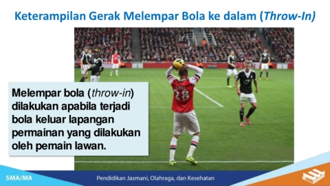 Keterampilan Gerak Melempar Bola ke dalam (Throw-In) Melempar bola (throw-in) dilakukan apabila terjadi bola keluar lapangan permainan yang dilakukan oleh pemain lawan.