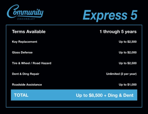 Express 5 Terms Available 1 through 5 years Key Replacement Up to $2,500 Glass Defense Up to $2,000 Tire & Wheel / Road Hazard Up to $2,500 Dent & Ding Repair Unlimited (2 per year) Roadside Assistance Up to $1,000 TOTAL Up to $8,500 + Ding & Dent
