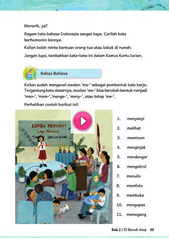 Kalian sudah mengenal awalan ‘me-’ sebagai pembentuk kata kerja.