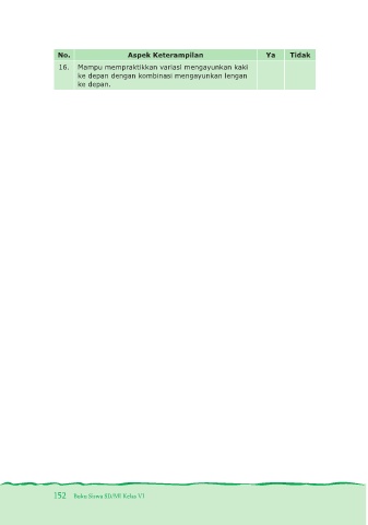 No. Aspek Keterampilan Ya Tidak 16. Mampu mempraktikkan variasi mengayunkan kaki ke depan dengan kombinasi mengayunkan lengan ke depan. 152 Buku Siswa SD/MI Kelas VI