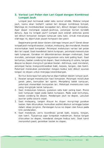 lompat jauh meliputi awalan, tolakan, melayang, dan mendarat. Awalan
