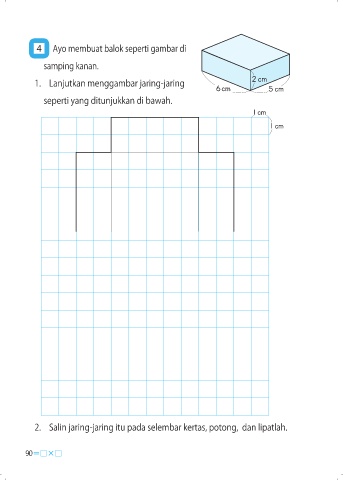 4 Ayo membuat balok seperti gambar di samping kanan. B 1. Lanjutkan menggambar jaring-jaring B B seperti yang ditunjukkan di bawah. B B 2. Salin jaring-jaring itu pada selembar kertas, potong, dan lipatlah. 90=□×□