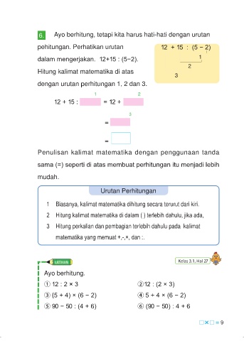 pehitungan. Perhatikan urutan 12 + 15 : (5 − 2)