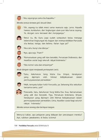 : “Wah, ternyata kalian hafal Pancasila, ya. Sekarang kita sebutkan