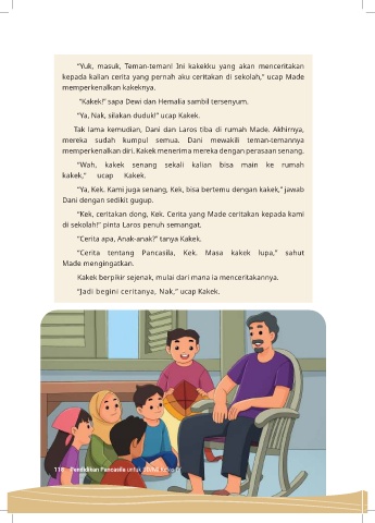 “Cerita tentang Pancasila, Kek. Masa kakek lupa,” sahut