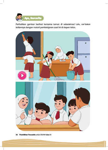 Ayo, Bercerita Perhatikan gambar berikut bersama teman di sebelahmu! Lalu, ceritakan kaitannya dengan materi pembelajaran saat ini di depan kelas. 56 Pendidikan Pancasila untuk SD/MI Kelas IV