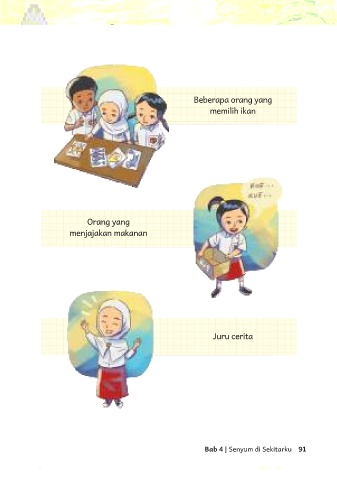 Beberapa orang yang memilih ikan Orang yang menjajakan makanan Juru cerita Bab 4 | Senyum di Sekitarku 91