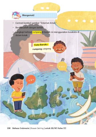• Cermati kembali gambar “Internet Aman”. • Berdiskusilah dengan teman. • Lengkapi kalimat rumpang di bawah ini menggunakan kosakata di dalam kotak. Kata Baruku rumpang: ompong 190 Bahasa Indonesia | Kawan Seiring | untuk SD/MI Kelas III