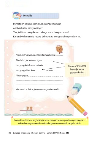 Menulis cerita tentang bekerja sama dengan teman pasti menyenangkan.
