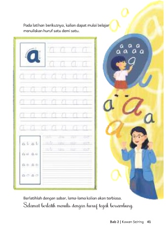 Pada latihan berikutnya, kalian dapat mulai belajar menuliskan huruf satu demi satu. Berlatihlah dengan sabar, lama-lama kalian akan terbiasa. Selamat berlatih menulis dengan huruf tegak bersambung. Bab 2 | Kawan Seiring 41
