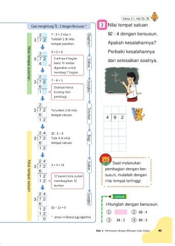 Cara menghitung 72 : 3 dengan Bersusun * 3 Nilai tempat satuan