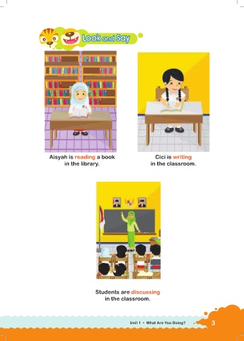 Aisyah is reading a book Cici is writing in the library. in the classroom. Students are discussing in the classroom. Unit 1 • What Are You Doing? 3