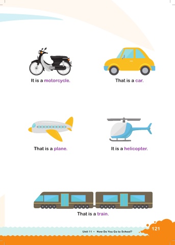 It is a motorcycle. That is a car. That is a plane. It is a helicopter. That is a train. 121 Unit 11 • How Do You Go to School?