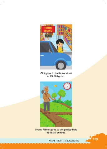Cici goes to the book store at 09.00 by car. Grand father goes to the paddy field at 06.30 on foot. 129 129 Unit 12 • He Goes to School by Bike