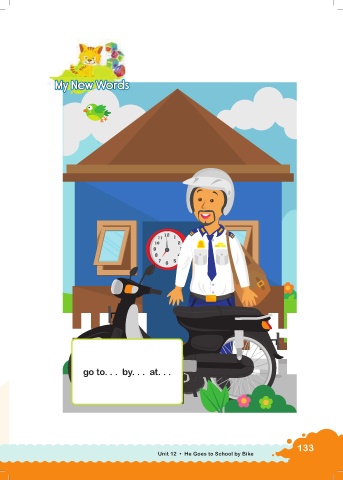 go to. . . by. . . at. . . 133 133 Unit 12 • He Goes to School by Bike