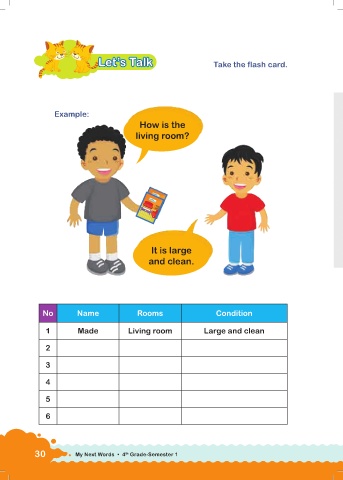 Let Let’s Talk’s Talk Let’s Talk Take the flash card. Let alk s T ’ Example: How is the living room? It is large and clean. No Name Rooms Condition 1 Made Living room Large and clean 2 3 4 5 6 30 My Next Words • 4 Grade-Semester 1 th