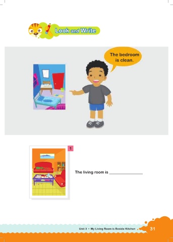 rite rite W W Look and Write Look and W rite Look Look and and The bedroom is clean. 1 The living room is _________________ Unit 3 • My Living Room is Beside Kitchen 31
