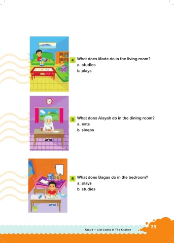 4 What does Made do in the living room? a. studies b. plays 5 What does Aisyah do in the dining room? a. eats b. sleeps 6 What does Bagas do in the bedroom? a. plays b. studies 39 Unit 4 • Cici Cooks in The Kitchen