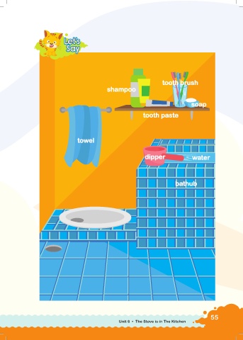 Let’s et’s L et’s L Let’s Say Say Say Say tooth brush tooth br ush shampoo shampoo soap soa p tooth paste tooth paste tow el towel dipper dipper water w ter a ba thub bathub 55 Unit 6 • The Stove is in The Kitchen