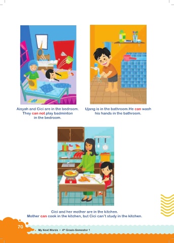 Aisyah and Cici are in the bedroom.       Ujang is in the bathroom.He can wash