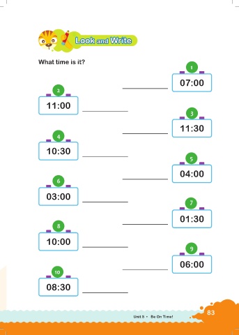 Look Look and W rite Look Look and Write rite rite W W and and What time is it? 1 07:00 2 11:00 3 11:30 4 10:30 5 04:00 6 03:00 7 01:30 8 10:00 9 06:00 10 08:30 83 Unit 8 • Be On Time!