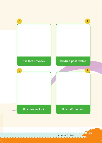 5 6 It is three o’clock It is half past twelve 7 8 It is nine o’clock It is half past six 85 Unit 8 • Be On Time!