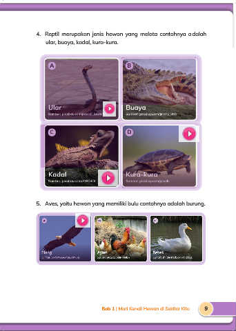 4. Reptil merupakan jenis hewan yang melata contohnya adalah ular, buaya, kadal, kura-kura. 5. Aves, yaitu hewan yang memiliki bulu contohnya adalah burung. Bab 1 | Mari Kenali Hewan di Sekitar Kita 9