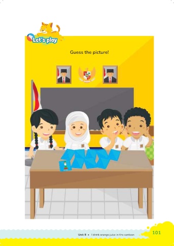 s play t’ s play s play t’ Let’s play Le Le Le t’ Guess the picture! 100 Unit 8 • I drink orange juice in the canteen 101