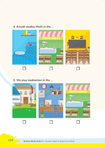 4. Aisyah studies Math in the … KANTIN BHINEKA ☐ ☐ ☐ 5. We play badminton in the … KANTIN BHINEKA ☐ ☐ ☐ 108 My Next Words Grade 3 • Student’s Book for Elementary School 109